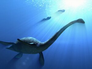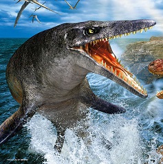・全長13~18m、重量20~40tになる巨大な肉食恐獣である。視界に入るものは何でも襲うほど凶暴とされているが、舟を襲う事は(美味くないので)余りなく漁民が船の下を泳ぐ姿を目撃し、慌てて逃げかえったという話もある。一見敵無しに見えるモササウルスだが恐獣の例に漏れず寒さに弱いため、生息域は限られる。