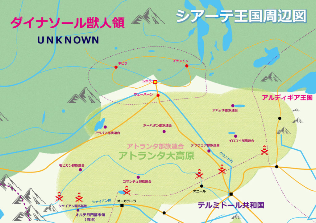 アトランタ大陸の元からの住人である獣人達が住まう大高原。800年もの長きに渡る戦乱の中で、現在の七部族連盟にまとまっていった。農耕と狩猟が主産業であり、主に馬・牛の四獣族や羊・山羊といった中~大型の草食系獣人で多数が占められている(東の狼族が実は珍しい、戦闘民族と言われるアパッチやモヒカンは猫系等の肉食系獣人が多い)