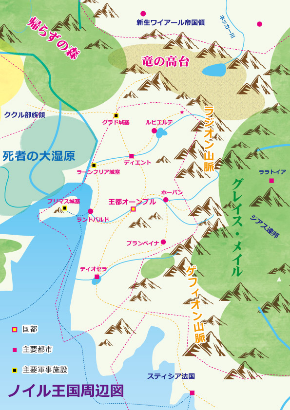 七聖母の一柱、蒼華の癒姫”ホーリエル”の最高神殿を国内に持つ。前身のノエル王国の建国は聖歴450年頃、その後奴隷売買をめぐりジアス連邦と対決し敗れて国が亡ぶ(605年)その後、北の大平原での戦乱から逃れた人々が七聖母教団の神官に導かれ竜の高台を乗り越え入植を開始。入植を指導した神官が還俗しジアス連邦と不可侵条約を締結し720年に建国。四方を難所に囲まれておりそれに対するため兵の練度はそれなりに高い。国のイメージはベルギー、オランダあたり。