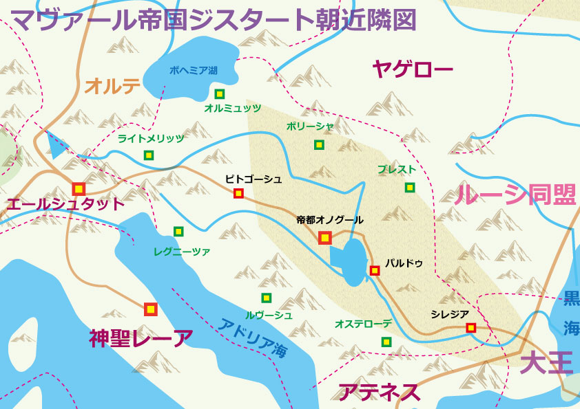 破邪の尖角「氷」ラヴィアスを奉ずる。帝国の北方、ボヘミア湖を挟んでオルテと対する獣人族(ザウリア)の国。公都はオルミュッツ。