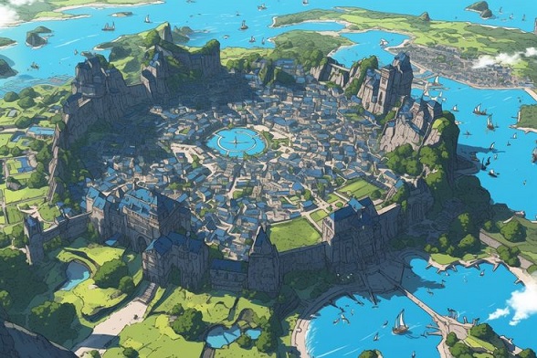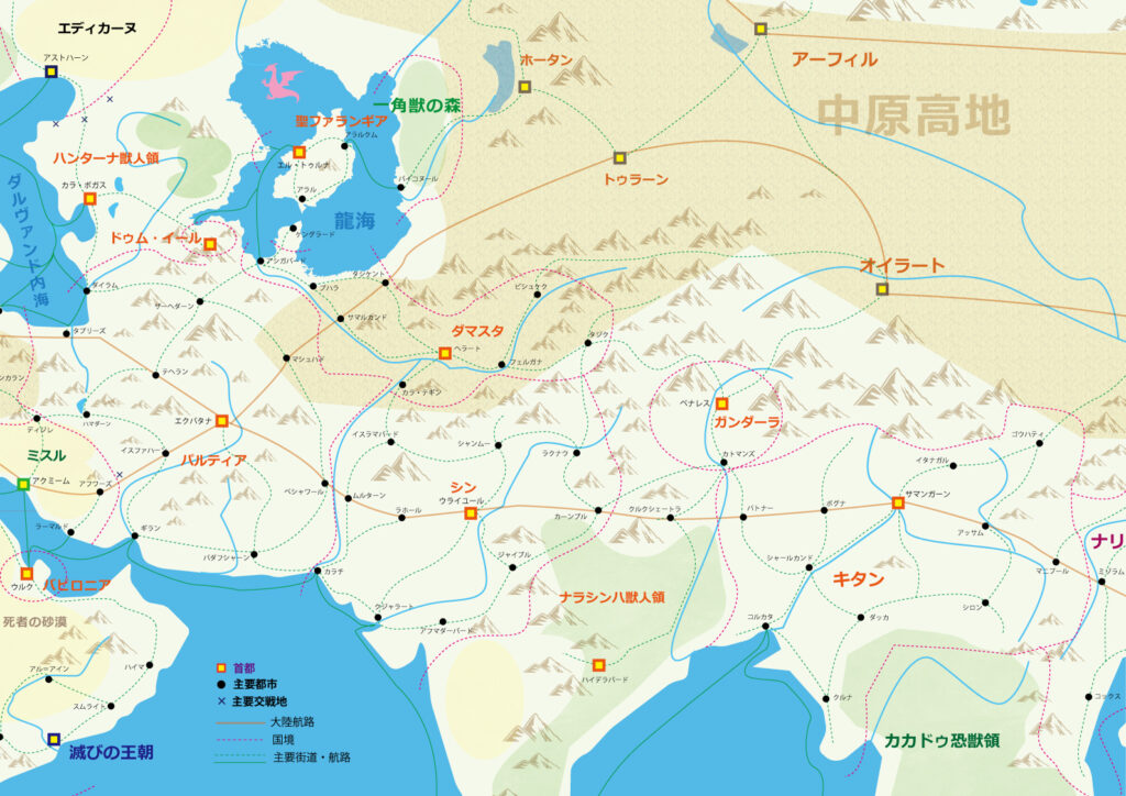 周囲を竜海に囲まれた地の門のある聖なる島ルルクを中心に、北は竜の大河でガリティア・メイルとつながり、東岸は一角獣の森が広がり、ホータン王国や大陸航路と中原高地へと続く、西岸はハンターナ獣人領と塩の荒野へと…