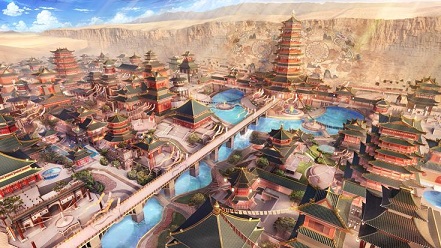 ・楼蘭(人口:18万)顔料でカラフルに着色された干し煉瓦の城壁で囲まれた交易都市。家々は干し煉瓦で建てられているが、付近に顔料の産出する地があるため、都市部の色彩はとても豊かである。