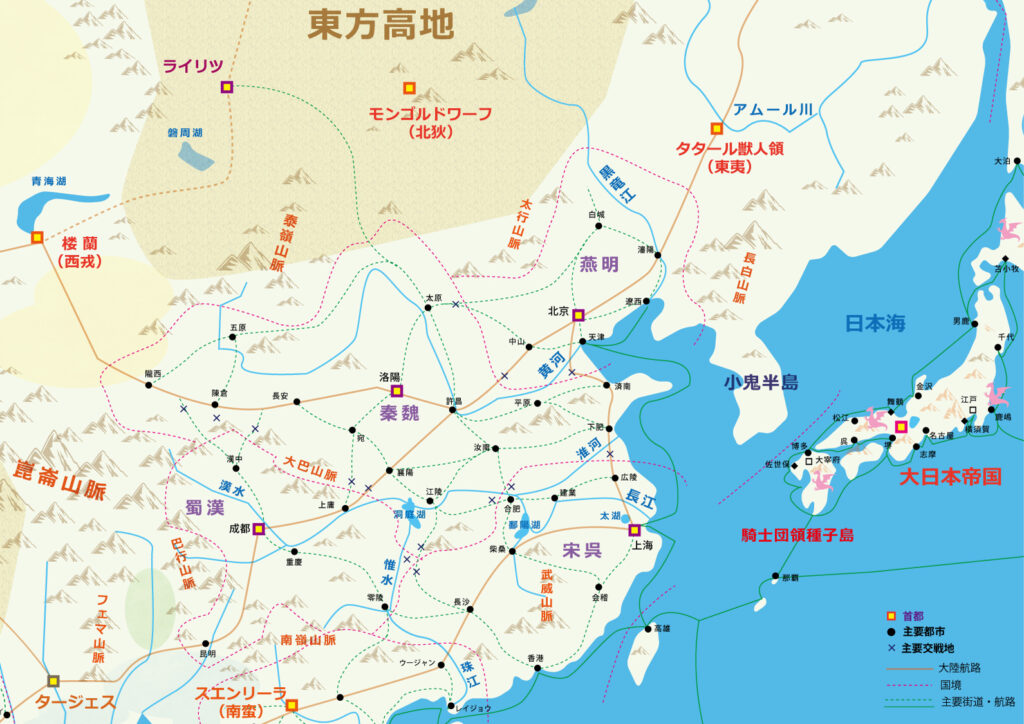 〇四雄国北辺の騎馬王国。燕洲、幽州、河州の大部分を支配下とし、兵の大部分が騎兵で構成されている。その機動力を活かした戦法は秦魏の大軍を幾度となく野戦で破っている。また、呉と結び海路を抑え、海洋交易は二国で独占している。タタール獣人領(東夷)とは傭兵契約を結んだりと硬軟織り交ぜた外交で平穏を保っている。外勢力で問題になるのは長白山脈を越えてやってくる妖魔(ゴブリン)の群れ。毎年一定の被害が出るため東部に張り付けた戦力は動かせない。