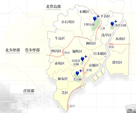 ※教育総監部のみ上野/上野公園のエリアは天翔船の開発・訓練エリア。日比谷公園エリアは護廷十三隊の本部&練兵施設。浅草と芝は市民の憩いの場。